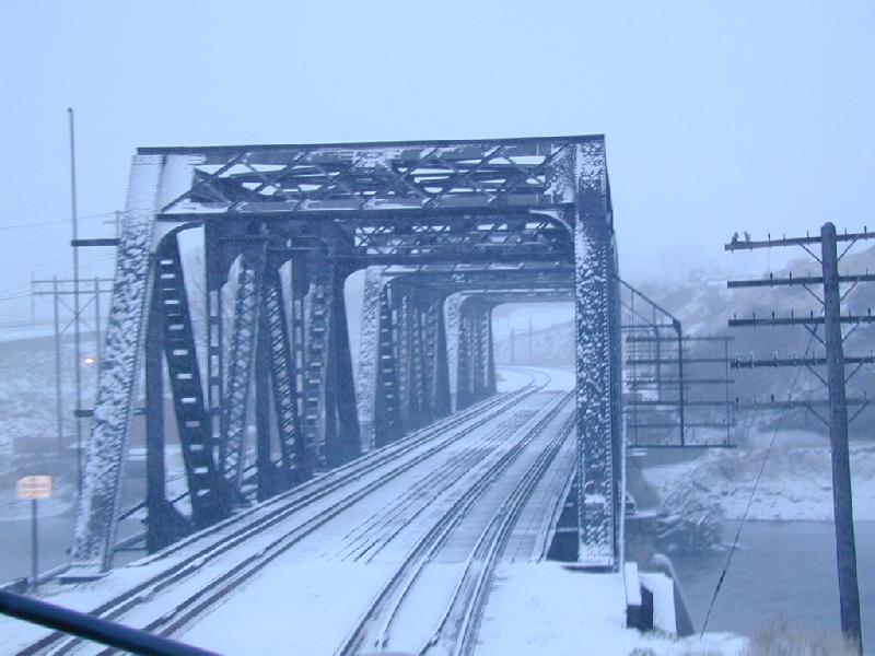 The next is the Yellowstone River bridge at Billings. It is about 3/4ths of a mile east of the signal bridge in the previous shot. Followers of this series have seen this bridge before. That one was from the other direction and taken standing outside on a U.P. SD90 but the weather coincidentally happened to be about the same.