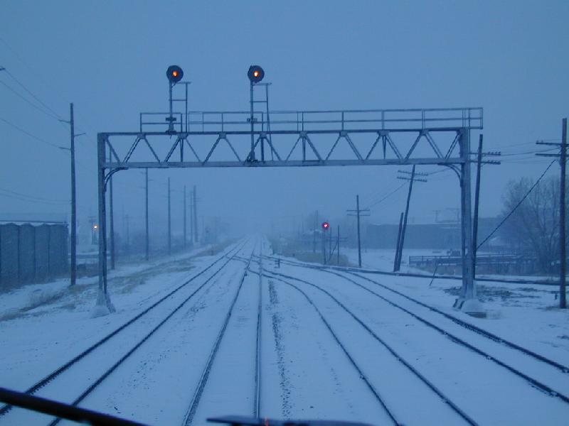 Due to the dim light the signals came out slightly over exposed. The two overhead are yellow, in fact the one on the right is flashing yellow but I managed to catch it in the "on" cycle. It is my signal approaching the End of Double Track ABS and Begin CTC about a mile away from this location.