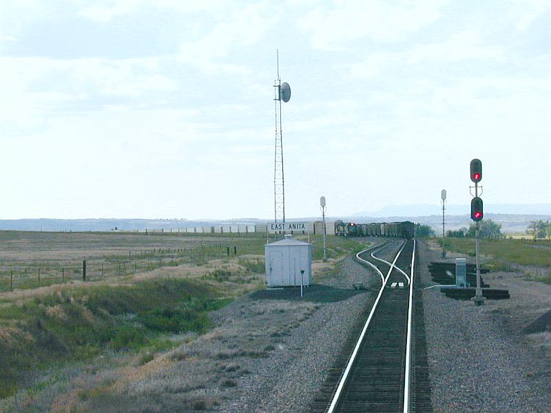The 3rd pic is on 7-1-00 from the P-KCMSSE. I am stopped at the east switch of Anita, Montana. A coal train is on the main ahead and the P-SSEMEM is pulling into the siding.