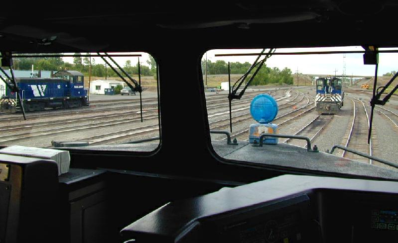 This photo is shot from the cab while pumping the air up on my train that same day. It shows the carman's "Blue Light" on the nose. The MRL's 2nd shift "Bottom of the Westbound" and "Bottom of the Eastbound" yard goats are taking a short lunch break. My train is the S-WENMEM3-09, Stack train from Wenatchee, Washington to Memphis, Tennessee.